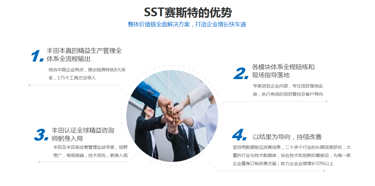 賽斯特集團(SST)是豐田為背景的一家致力于企業(yè)管理咨詢、培訓服務為主的國際化管理咨詢機構(gòu),依托于精益發(fā)源地豐田公司為背景的專家團隊,專業(yè)從事精益生產(chǎn)培訓和咨詢服務的管理咨詢機構(gòu),中國本土唯一一家融合日本豐田,北京現(xiàn)代,韓國三星等專家為一體的咨詢機構(gòu)。旗下?lián)碛校禾旖蛸愃固仄髽I(yè)管理咨詢公司,天津眾益天成管理咨詢公司,北京冠群精益管理咨詢公司,天津精益智能咨詢有限公司等四家分支機構(gòu)。